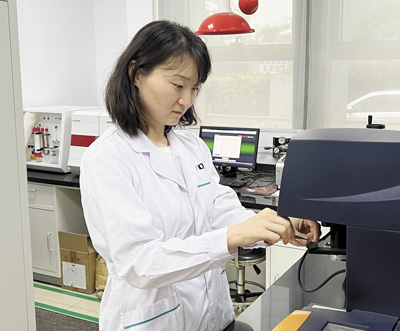 南京市产品质量监督检验院绿色可降解材料质检中心副主任朱南帮企业做测试实验。