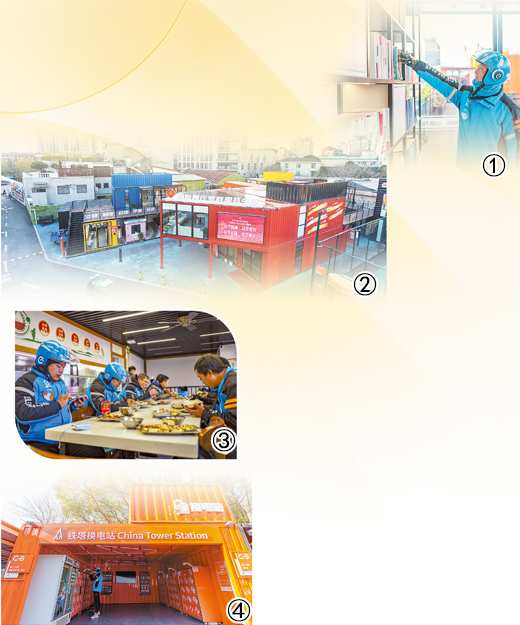 图④:外卖配送员在万有引力党群服务中心内的换电站更换电动自行车电池。
